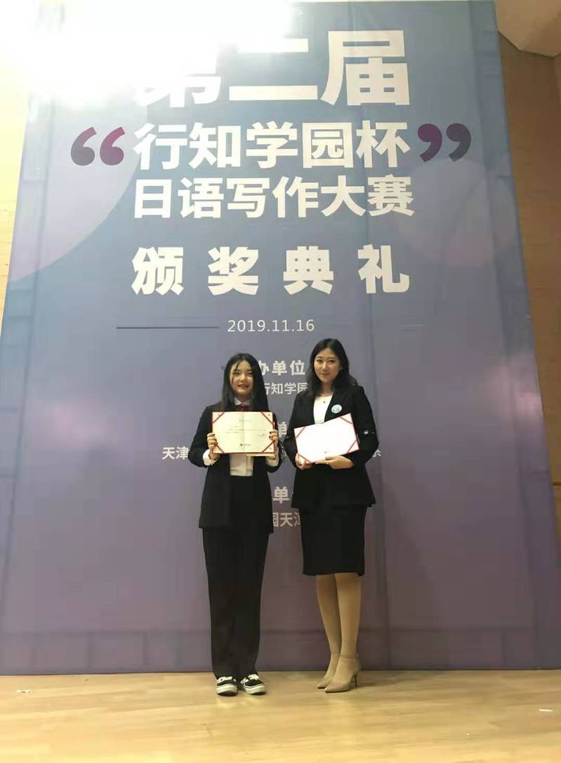(通讯员:李雨晴)为了加强中日两国的积极往来,促进中日文化交流与发展,由行知学园主办、行知学园天津校协办、天津外国语大学滨海外事学院日语系承办开展了第二届“行知学院杯”日语写作大赛。在本次大赛中,pg娱乐2017级日语专业学生李雨晴荣获“专业组二等奖”的优异成绩,其指导教师渡部惠老师荣获“优秀指导教师奖”。11月16日上午10点,李雨晴同学与渡部惠老师赴天津外国语大学参加了颁奖典礼。