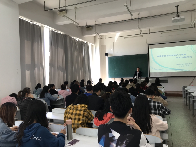 报告会上,于长敏教授以王晋康、吴岩、朝松健等作家的作品为例,谈科幻小说・志怪小说对传统文化的应用。首先,于教授谈到科幻作品内容的丰富源于作家广博的科学知识。接着,具体分析王晋康的长篇小说《古蜀》,吴岩的短篇小说《太空聊斋案》、《老子幽灵车案》等,是如何把过去与未来巧妙地连接在一起的,还有日本作家朝松健的志怪小说也充满传统文化元素。王晋康、吴岩的科幻小说、朝松健的志怪小说,以及神话小说《西游记》等,这些作品的共同之处是把传统文化引入到现代作品中,并且面向未来。因此,提出观点:“既然小说要引用传统,面向未来,文学作品就应成为连接过去和未来的桥梁。而科幻小说应首先担负起这一历史重任,成为把过去和未来连接起来的文化载体”。于教授生动的讲解、精辟的分析和独到的见解赢得了同学们的阵阵掌声,会场氛围热烈。