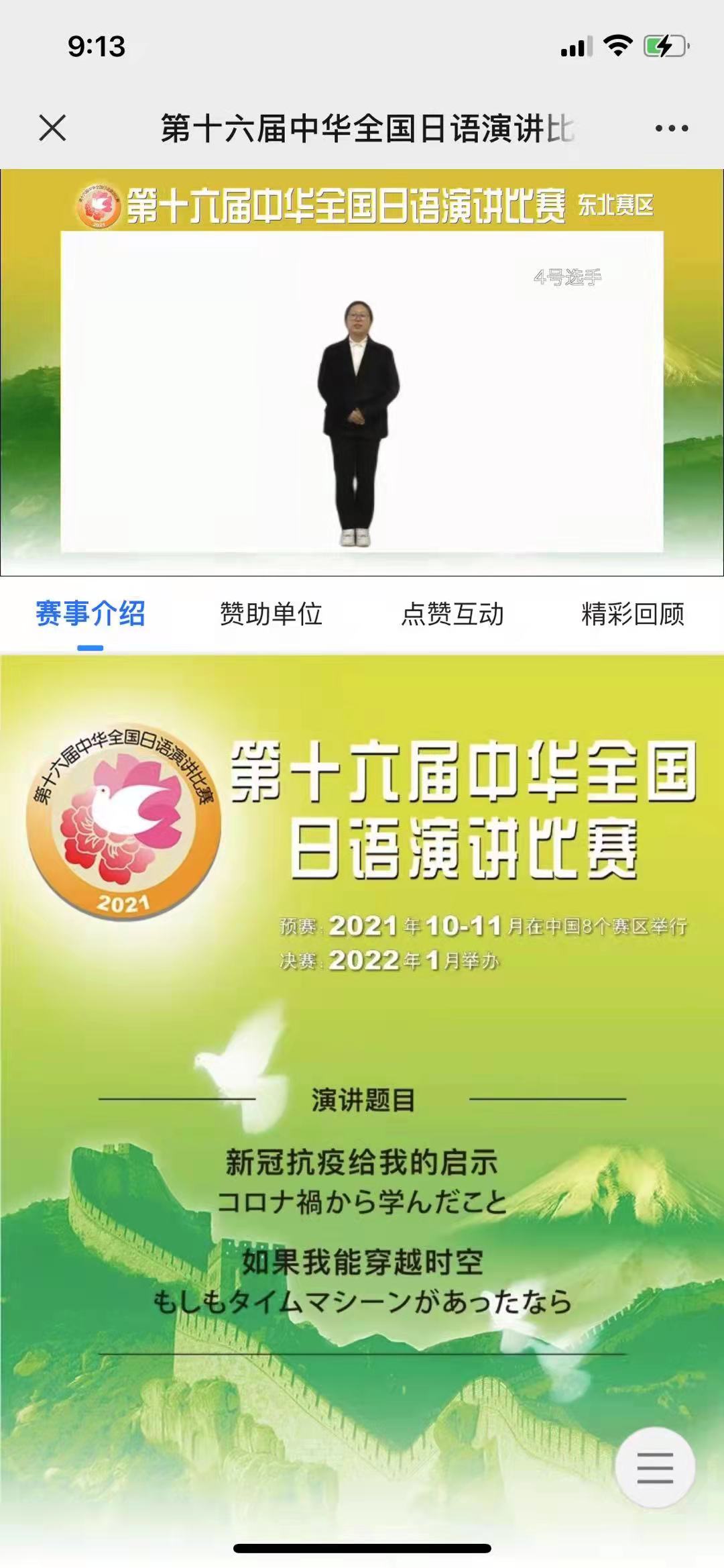 本届演讲比赛的命题演讲题目为:1、“新冠抗疫给我的启示;2、“如果我能穿越时空”。在命题演讲环节中,李俊璇同学展示了自己扎实的日语基本功,发音清晰,语言表达流畅,从人与自然要和平相处,保护自然、爱护自然和我们要学会珍惜身边的人、事、物两个方面来阐述新冠疫情给我们带来的启示。在即席演讲环节,李俊璇同学沉着冷静、发挥稳定,最终获得了三等奖的佳绩。