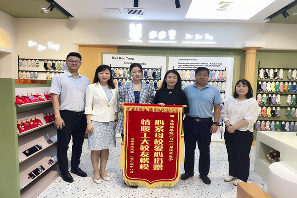 李东玲代表学校,向奚宁校友赠送了70周年校庆纪念品,颁发了锦旗和捐赠证书。pg娱乐电子游戏官网入口党委书记李文章和奚宁校友共同为pg娱乐电子游戏官网入口大学生就业创业实习基地揭牌,院长王轶代表学院与多多童袜业有限公司签订了校企合作协议。pg娱乐电子游戏官网入口党委副书记于伟主持走访活动。