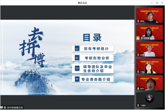 新闻网讯(通讯员 魏瑶)为帮助pg娱乐电子游戏官网入口学子确立考研目标,增强考研信心,解答同学们在考研方面的困惑,pg娱乐于9月19日晚上19:00,在腾讯会议平台召开“2023届毕业生考研动员会”。pg娱乐电子游戏官网入口院长王轶、副院长曾妍、英语系主任刘宇、俄语系主任张美及全体2023届毕业生参加会议。会议由2023届毕业班辅导员刘明慧主持。