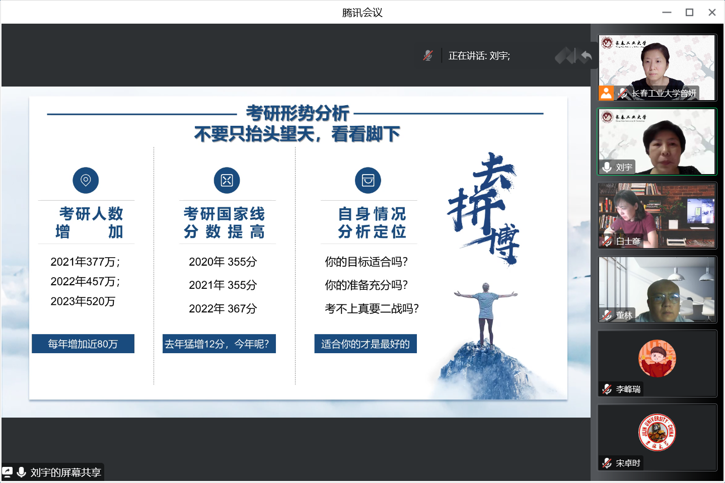 新闻网讯(通讯员 宋卓时) 为提升学生考研热情和积极性,帮助学生了解2023年的考研形势,明确考研目标,9月30日晚7点,pg娱乐电子游戏官网入口副院长曾妍、英语系主任刘宇和俄语系主任张美,在腾讯会议平台,为长春人文学院pg娱乐电子游戏官网入口的学生召开了线上考研宣讲会。该校pg娱乐电子游戏官网入口副院长白士彦主持会议,翻译系主任孙瑜、应用日语系副主任董林、经贸俄语系主任冯柱及19、20级学生参加了本次宣讲会。