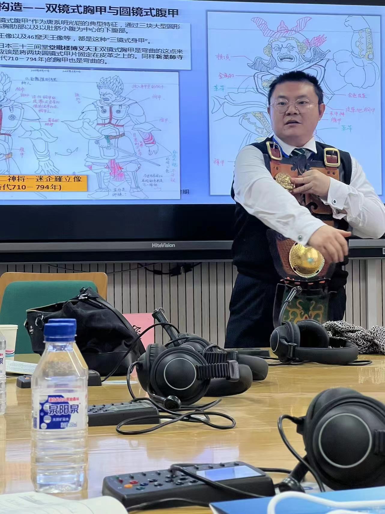 pg娱乐日语系宋卓时老师在第七分会场上展示其制作的唐代明光铠复原件