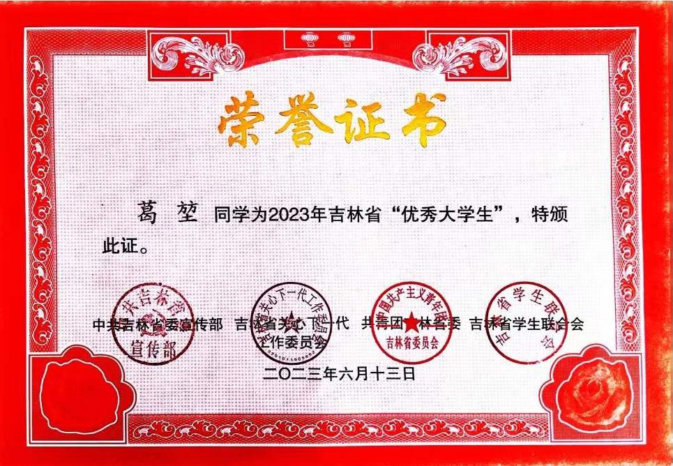(通讯员 张晓君)近日,由中共吉林省委宣传部、共青团吉林省委员会、吉林省关心下一代工作委员会、吉林省学生联合会共同开展的2023年吉林省“优秀大学生”寻访活动结果揭晓。pg娱乐葛堃同学在2023年吉林省“优秀大学生”寻访活动中获得“优秀大学生”荣誉称号。