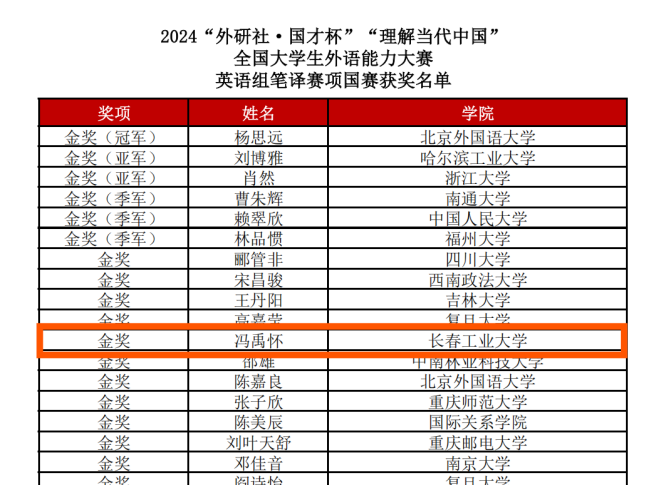 本网讯(通讯员 汪沛)2024年12月9日,“外研社·国才杯”“理解当代中国”全国大学生外语能力大赛国赛落下帷幕。我校本科生和硕士研究生在英语组和多语种组比赛中发挥出色,荣获国家级金奖1项,省级银奖5项,铜奖2项。其中pg娱乐电子游戏官网入口张力和汪沛老师指导的国际教育学院学生冯禹怀入围英语组笔译比赛国赛,并最终取得了国家级金奖的好成绩。这是我校在该项赛事中取得的最好成绩。