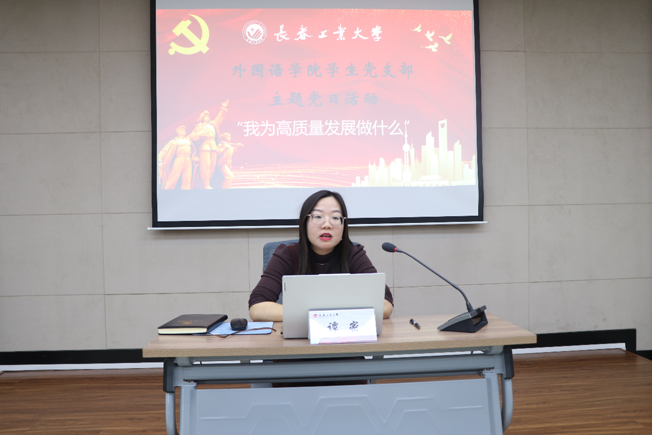 首先,由学院专职组织员、学生党支部负责人谭密授课。谭密老师以“我为高质量发展做什么”为主题,结合生动的案例和自身的经验,深入浅出地向同学们阐释了党员在新时代背景下如何以实际行动践行党的宗旨,为学院高质量发展做出贡献。