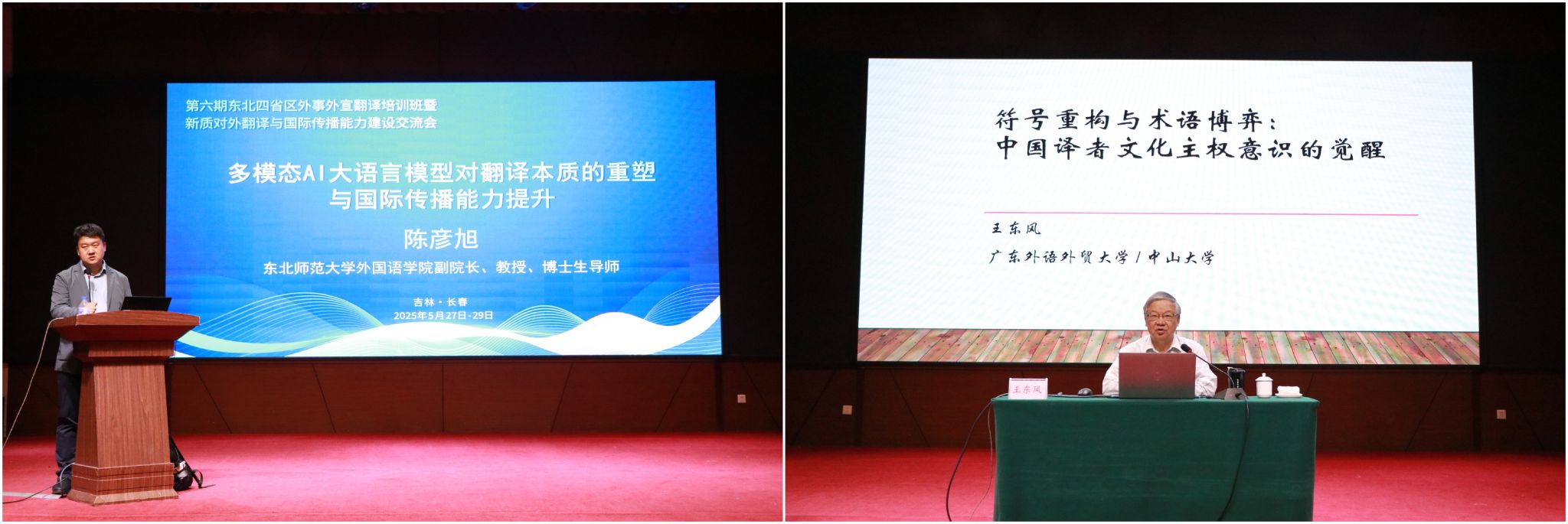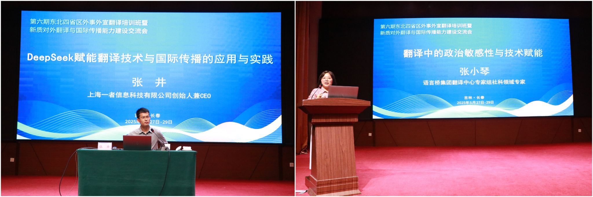 5月27日下午至5月29日,国内4位知名学者和专家为参训学员作专题培训。东北师范大学pg娱乐电子游戏官网入口副院长陈彦旭教授作了题为《多模态AI大语言模型对翻译本质的重塑与国际传播能力提升》的专题讲座。广东外语外贸大学英语语言文化学院王东风教授作了题为《符号重构与术语博弈:中国译者文化主权意识的觉醒与实践》的专题讲座。上海一者信息科技有限公司创始人兼CEO张井作了题为《DeepSeek赋能翻译技术与国际传播的应用与实践》的专题讲座。语言桥集团翻译中心专家组社科领域专家张小琴作了题为《翻译中的政治敏感性与技术赋能》的专题讲座。