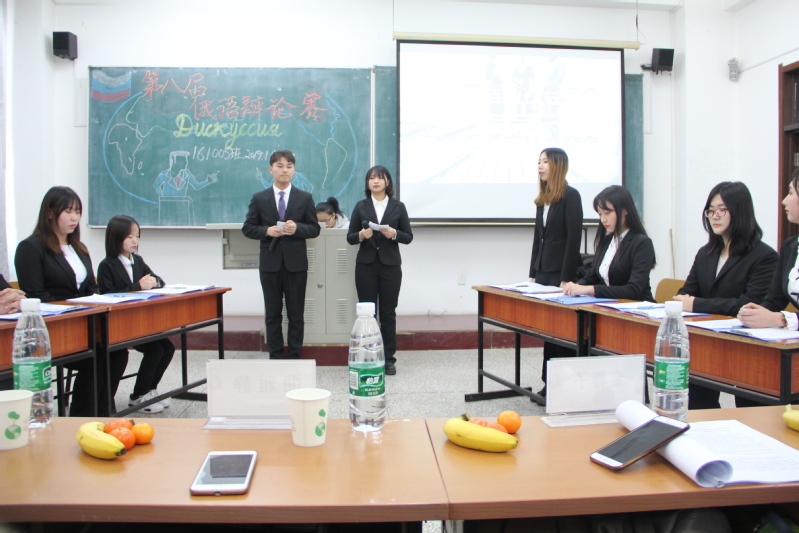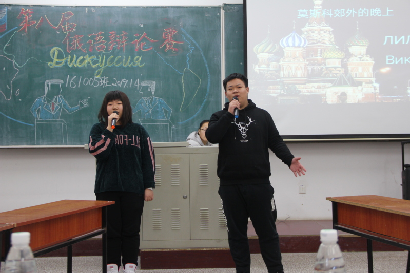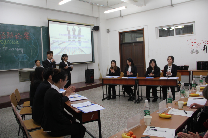 在大二同学美妙动听的开场歌声中,大赛开始。两位主持激情昂扬的中俄双语开场白后,辩论赛正式拉开帷幕。
