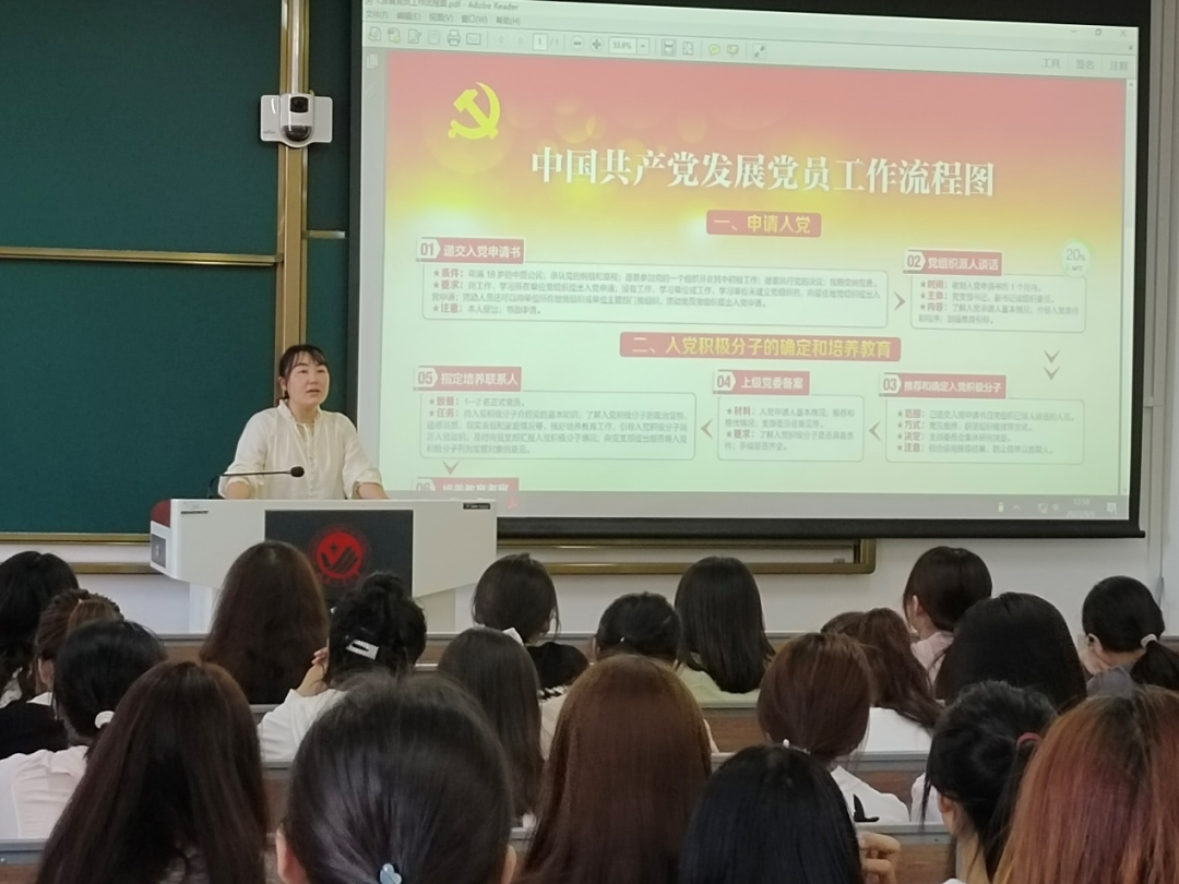 刘老师从递交入党申请书开始,成为积极发展、发展对象等入党流程一一详细讲解。当代青年大学生的政治方向关系着整个民族的发展前景,中国青年始终是中华民族实现伟大复兴的先锋力量,希望青年学生牢记初心、担当使命,在学习实践中磨砺能力和本领,践行“请党放心,强国有我”的誓言。