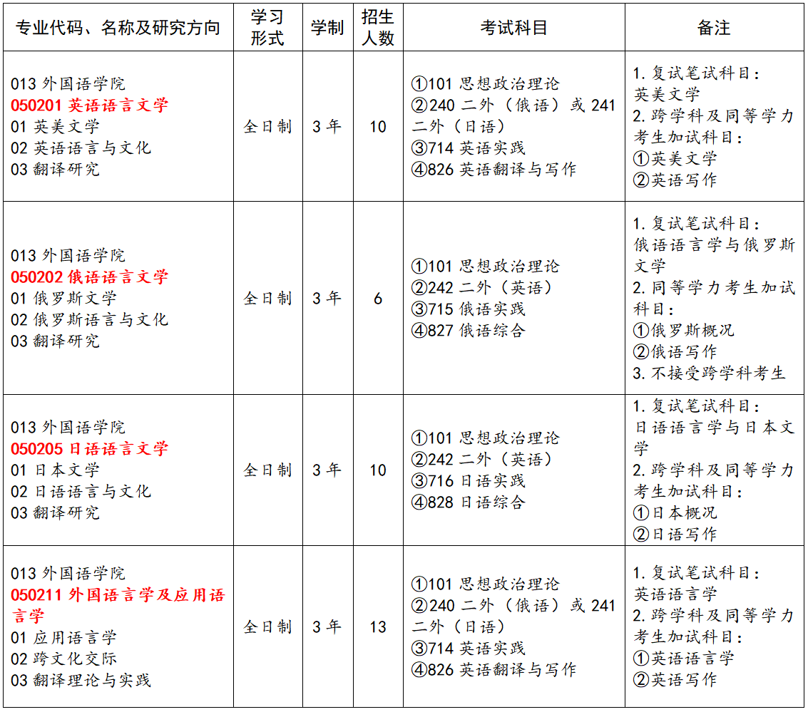 外国语言文学学位点经过长期的学科建设与发展,已经形成了英语语言文学、日语语言文学、俄语语言文学和外国语言学及应用语言学4个稳定并具有一定特色的学科研究方向。