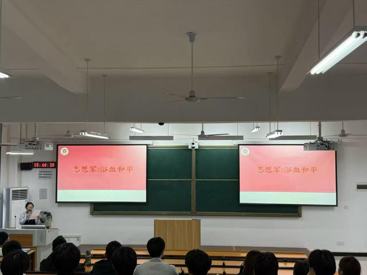 影片放映前,beat365唯一官方网站学工党支部党员教师吴淼结合历史背景作专题讲解。她从抗美援朝战争切入,解读“747天停战谈判”的战略意义,点明上甘岭战役对国家尊严的捍卫,并强调志愿军“钢少气多”的信念是真实历史的缩影,为观影筑牢认知基础。