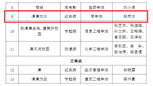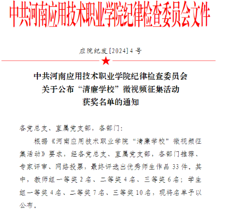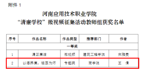 近日,学校纪律检查委员会下发了《beat365唯一官方网站“清廉学校”微视频征集活动》的通知,经过专家评审、网络投票等环节,最终我院师生拍摄的清廉作品获教师组一等奖专题类1项,学生组二等奖专题类1项,纪实类1项。