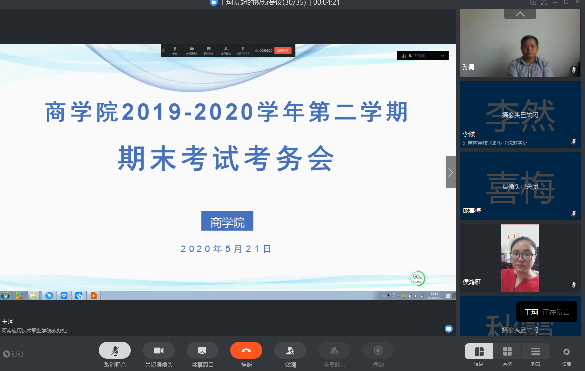 会上,王老师首先介绍了期末考试总体安排、期末考试试卷命题及改卷要求,并详细介绍了期末考试监考安排与要求。为保障师生生命安全和身体健康,根据疫情防控需要,本学期期末考试采用学习通平台进行线上集中考试。按照学校教务处要求,坚持公平、公正原则,采用钉钉群视频的形式进行监考。