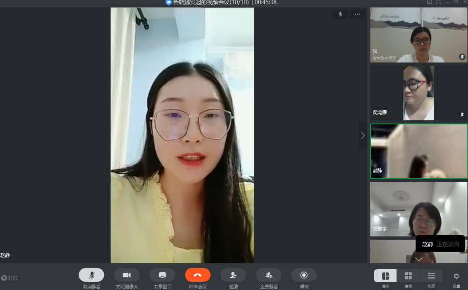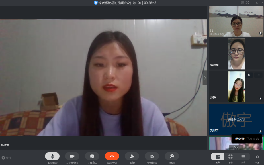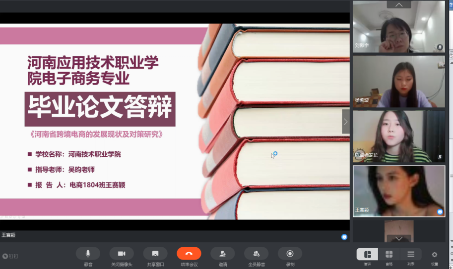 答辩评委教师组由电子商务专业负责人乔晓娜、物流管理专业负责人王珂、市场营销专业负责人范丽丽、连锁经营管理专业负责人侯鸿雁、空中乘务专业负责人刘傲宇组成。各专业毕业论文指导教师共同评审推荐一篇优秀毕业论文,18级陈卓睿、王赛颖、杨紫璇、赵静、巴特五位同学的论文在评审中脱颖而出,参加线上公开答辩。
