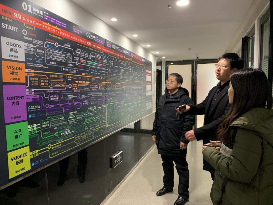 随后,孙勇院长一行到千蚁电商总部进行了参观,了解了企业工作环境、企业文化等,并向千蚁电商相关负责人询问了校企合作模式、管理体系、课程体系、师资配备、学生管理模式等。