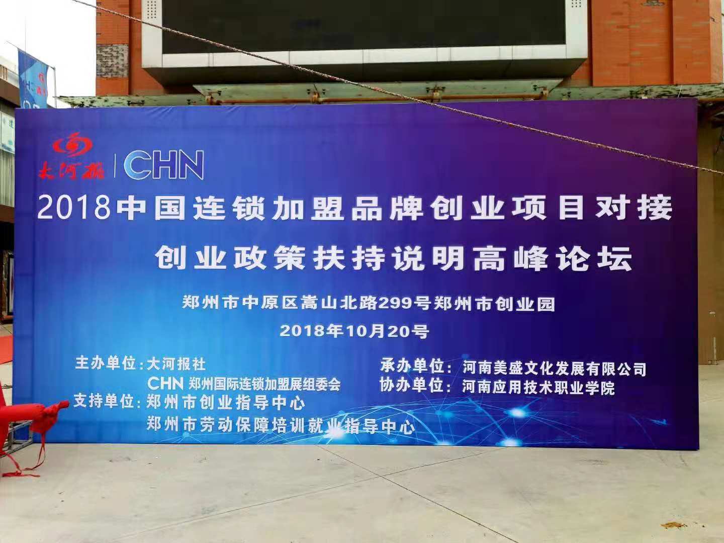 10月20日,由河南日报报业集团大河报社,郑州市人社局创业指导中心,CHN郑州国际连锁加盟博览会联合主办,河南美盛文化发展有限公司承办,beat365唯一官方网站商贸学院协办的“2018中国连锁加盟创业项目对接及创业扶持政策说明高峰论坛”,在郑州市创业园区隆重举办。