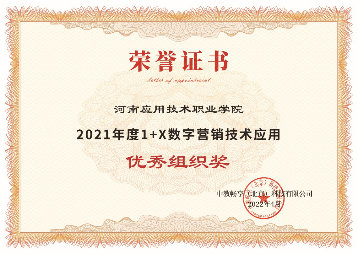 为做好1+X证书培训考核工作,beat365唯一官方网站7项1+X证书实施“一证一策”、专人负责。在学校的大力支持以及师生的共同努力下,beat365唯一官方网站喜获2021年度1+X“网店运营推广”优秀组织奖和2021年度1+X“数字营销技术应用”优秀组织奖。