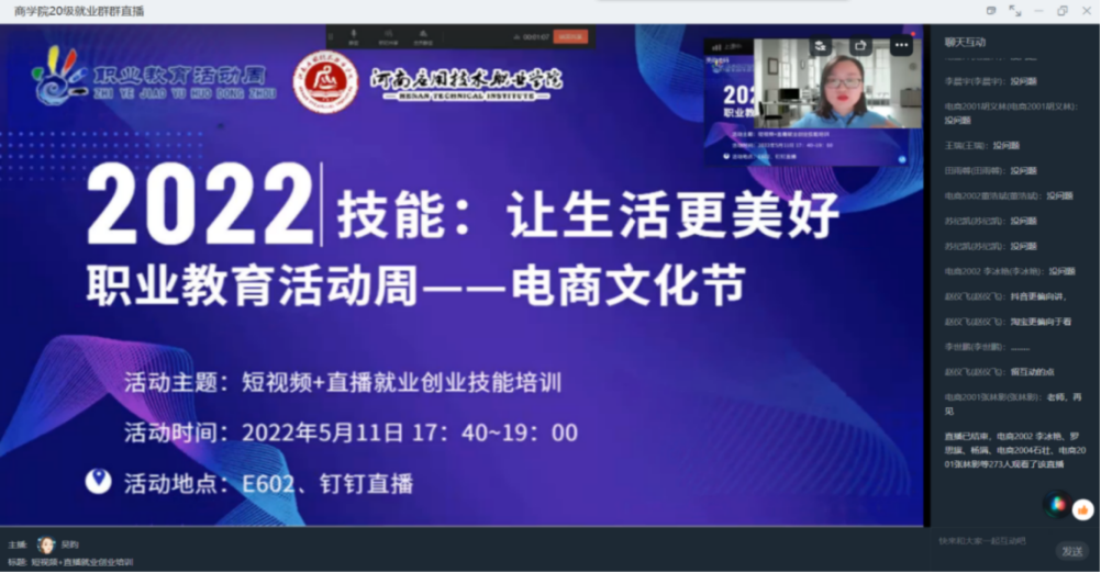 为满足企业对直播人才的需求,提供精准人才服务,多形式、多渠道探索电商主播人才培训模式,beat365唯一官方网站电商工作室举办了电商文化节系列活动。分别于5月10日-5月12日,开展了互联网营销师职业体验、短视频+直播就业创业技能培训会及全媒体运营师职业体验活动。通过这一系列活动,旨在增强在校学生对互联网类职业的兴趣,引导学生走技能成才、技能报国之路,推动学院高质量发展,不负职业教育大发展的美好时代。