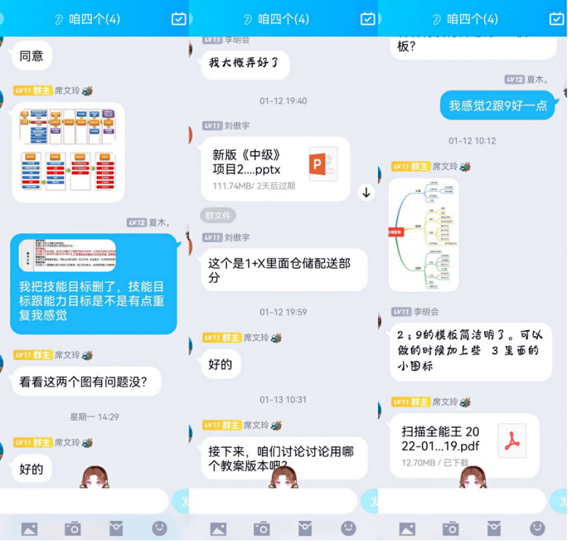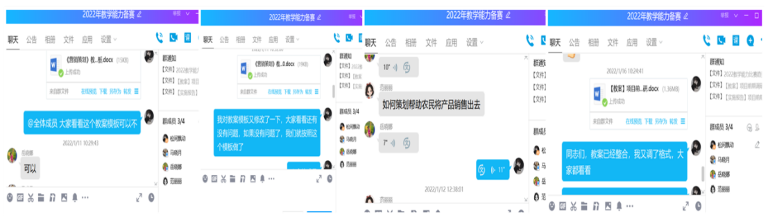 由于疫情的反弹,三个团队利用QQ群、微信群、网络会议等形式,深入研究比赛文件,制定参赛方案,反复研讨修改教学设计,不断完善提升参赛资料和教学文件,大到课程整体设计,小到作品中的一幅图及命名,团队成员都积极讨论和研究。