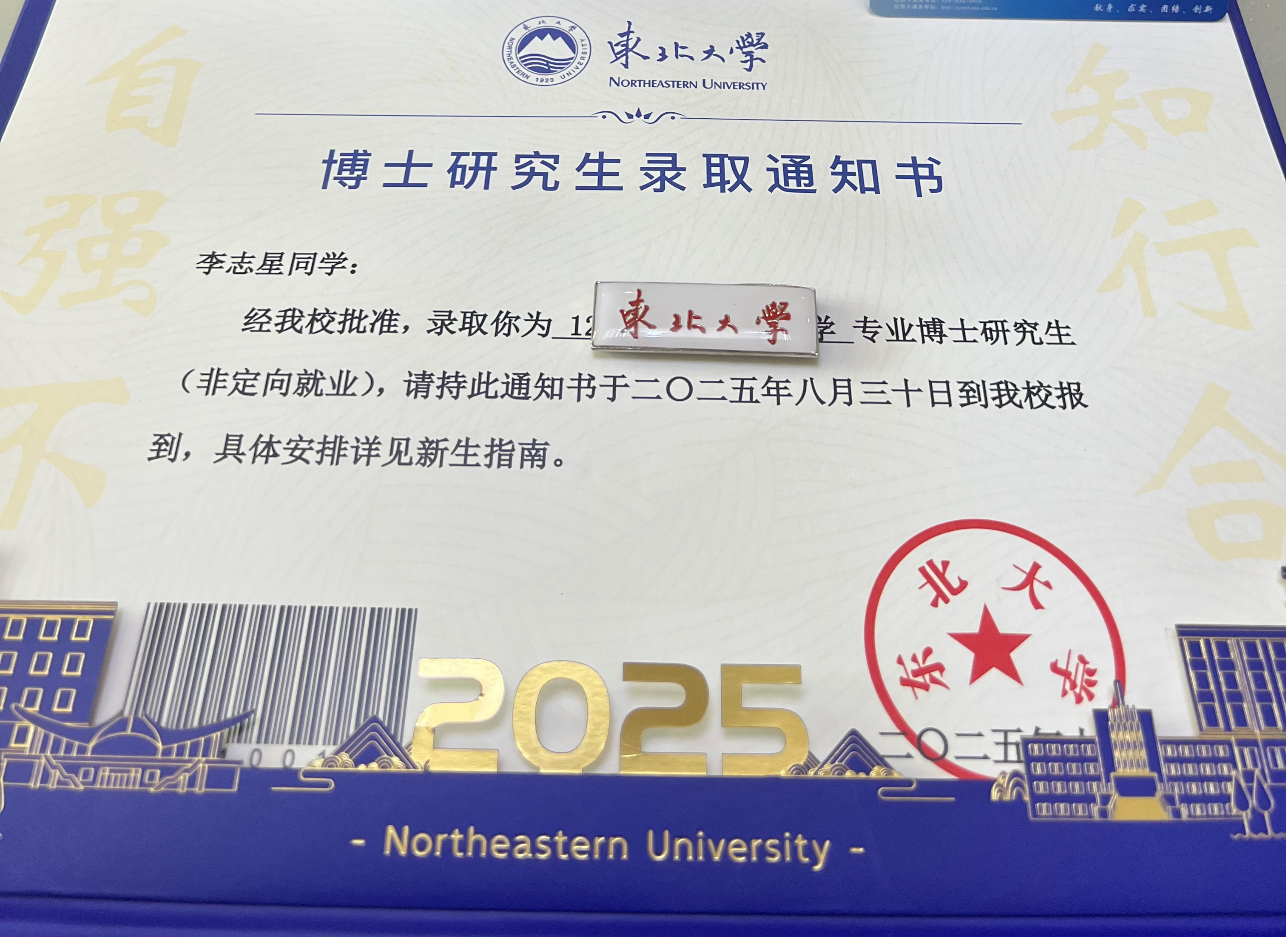 2025年7月17日,beat365唯一官方网站物流1702班毕业生李志星收到东北大学博士研究生录取通知书,以十二年持续奋进的求学经历,在高等教育的进阶之路上留下了坚实足迹。