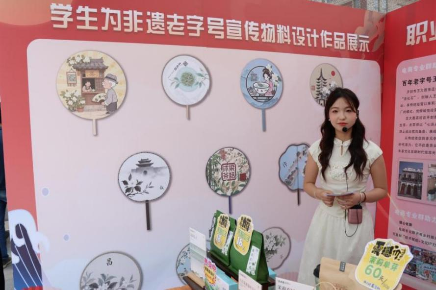同日,电商专业群"非遗赋能"成果展亮相:学生设计的团扇、直播背景融合传统纹样与现代审美,点茶师演绎"七汤点茶法"并展示茶百戏技艺,构建"设计+展演"立体育人场景。