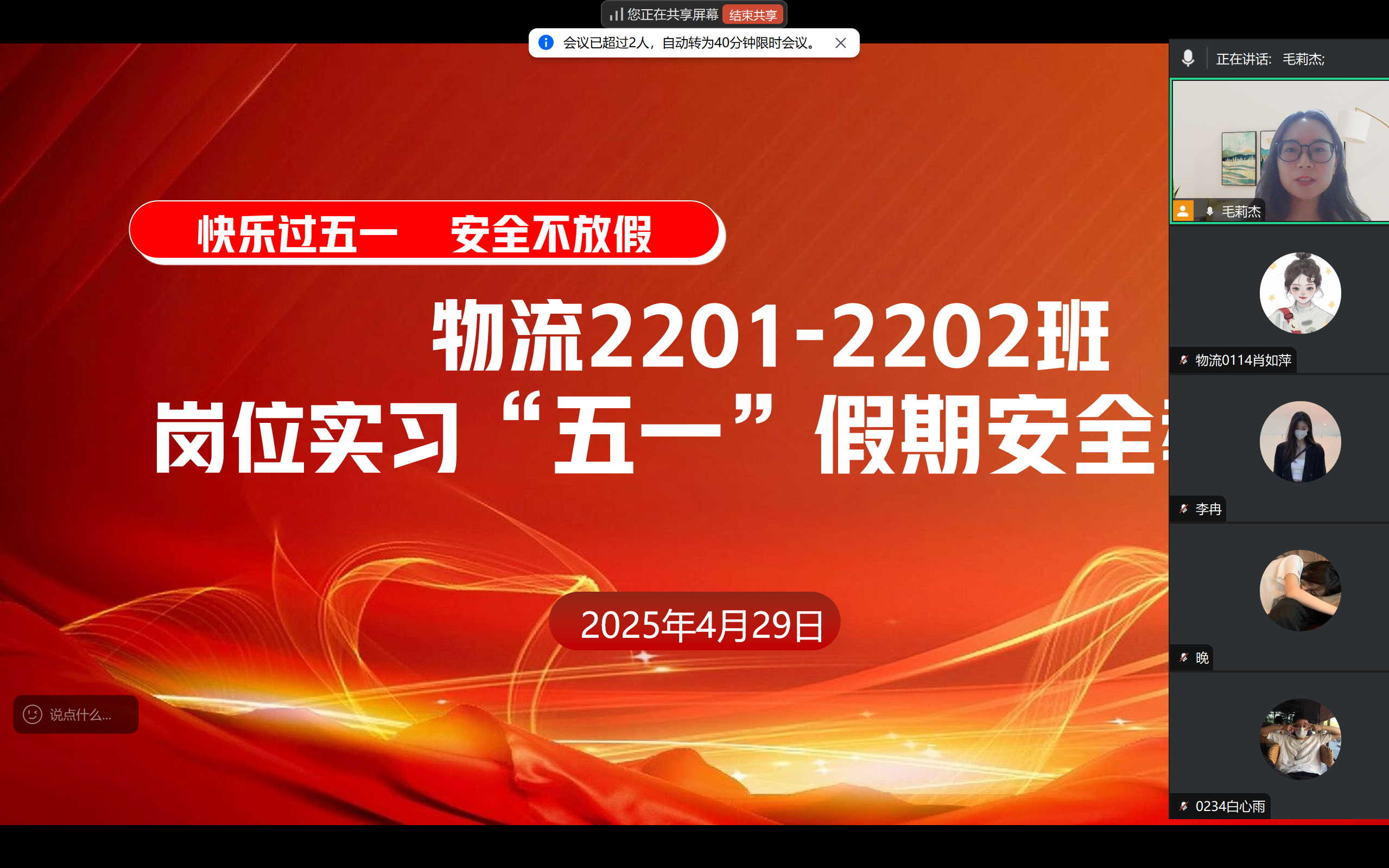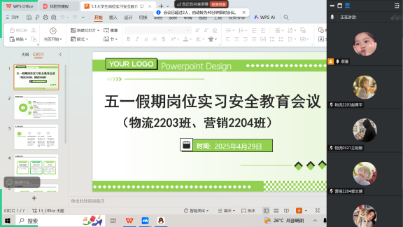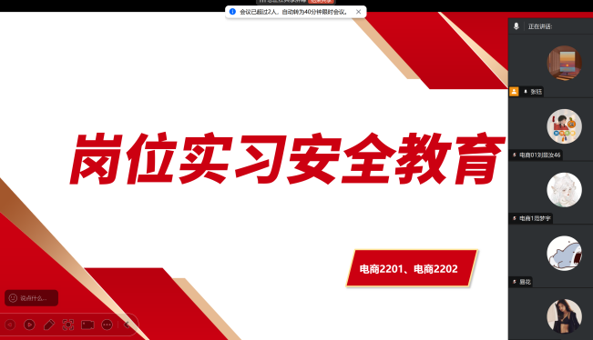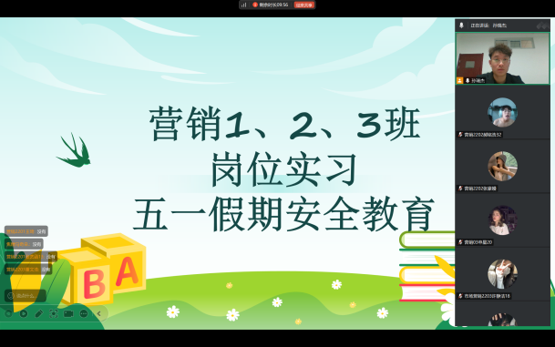 全体岗位实习指导教师对各班级学生开展线上安全教育活动。教育内容涵盖出行安全、消防安全、住宿安全、职业安全等多个方面,着重强调安全保护意识和防范能力的重要性,引导学生时刻保持警惕,确保自身安全。针对即将进入尾声的2022级岗位实习,特别提醒学生在假期前后做好实习收尾工作,整理实习资料,善始善终完成实习任务,同时在剩余实习期间更要绷紧安全弦,将安全规范落实到工作的每一个细节中。