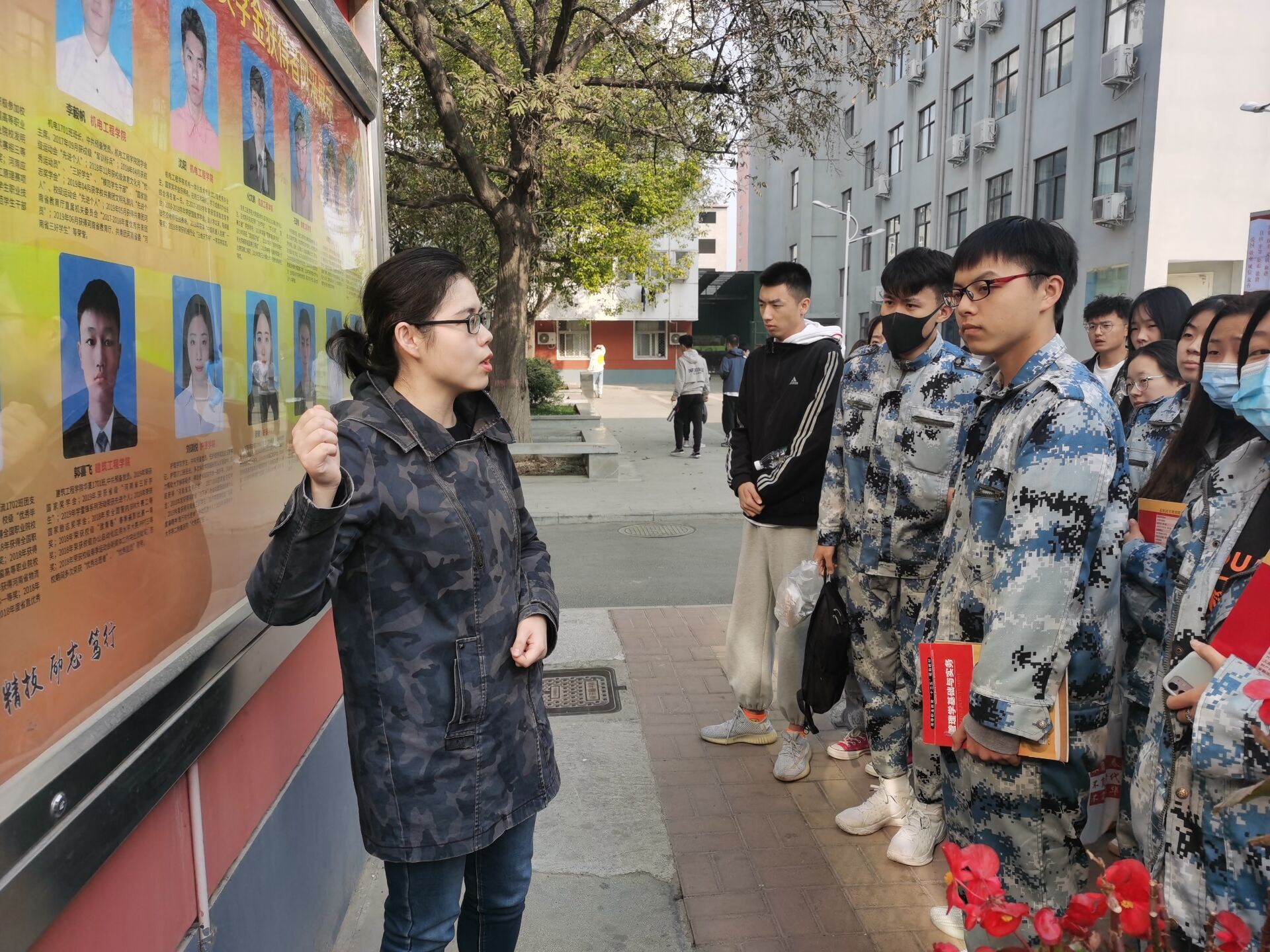 在运动场展架前,李力为同学们讲述了抗战英雄的先进事迹,带领同学们再一次重温了顾全大局、把纪律看的比生命还重要的邱少云事迹,甘于奉献,不求回报的雷锋精神,勇于开拓,忠诚履行使命的模范指挥员杨业功……。她希望同学们要以这些英雄人物为榜样,学习他们坚持理想信念、永葆先进性的政治品格,从先进典型的事迹中汲取精神营养,受到思想启迪,激发学习报国热情。