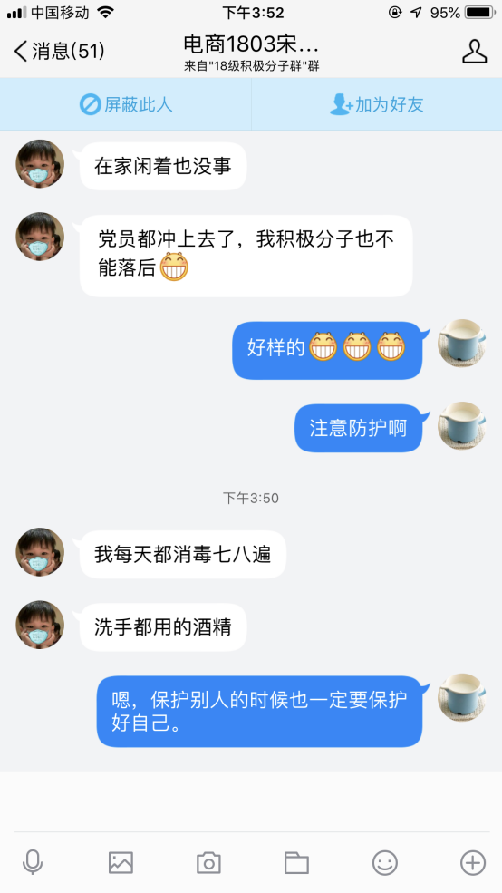 2、电商1803班宋潇南、裴成阳2位同学参与防疫志愿工作,在郑州市航空港区管委会担任疫情防控检测员。宋潇南同学平时就是个质朴热心的人,2019年郑州民运会期间就主动报名参加志愿服务。当问起这次的疫情志愿工作时,他说:党员都冲上去了,我作为积极分子也不能落后。”