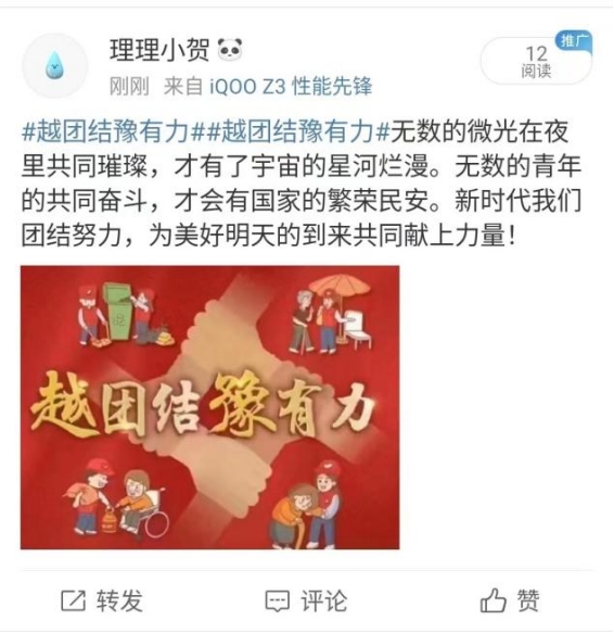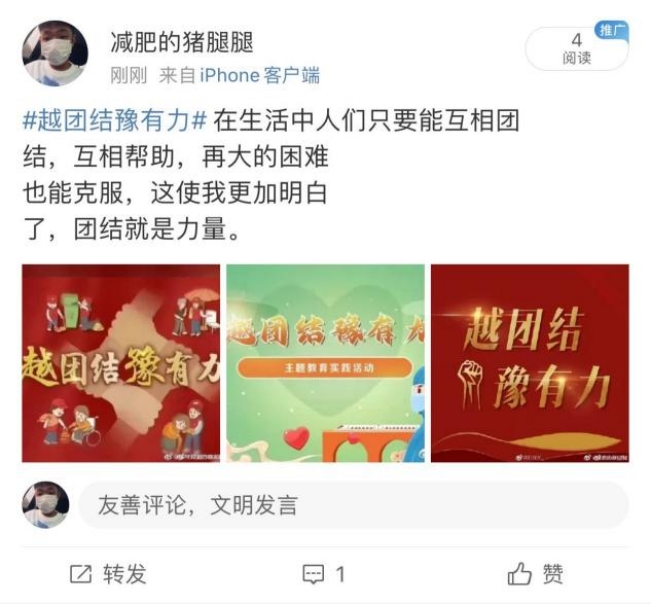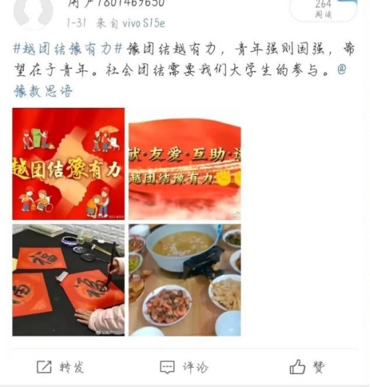 寒假期间,beat365唯一官方网站开展“越团结豫有力”主题教育实践活动,不仅希望在寒冬中给同学们带去温暖,更希望在新的一年、新的学期,带给同学们力量与勇气。我们一起来看看同学们是怎么表达的吧!