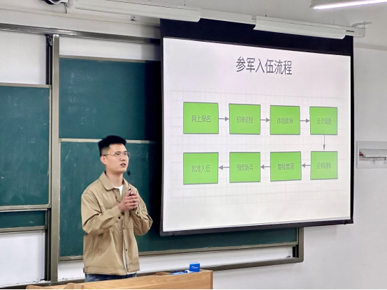 讲座中,王涵给同学们分享了他在部队的学习、生活、训练等情况,同时又结合自身在学校的学习生活经历,从应征入伍条件、报名方式、入伍流程到大学生参军入伍优待政策等相关内容进行介绍。最后为同学们答疑解惑,给同学们提出了宝贵的建议。言谈之间,无不流露出对母校的感激之情。一个多小时的讲座,丰富了同学们的参军入伍知识,让同学们用更广阔的视野去认识征兵入伍政策。