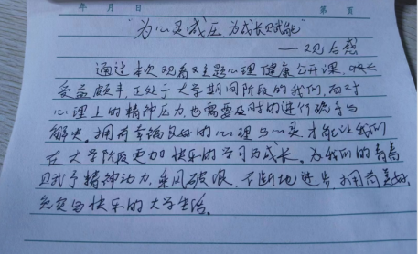 物流2201班马媛珂说:“我们的社会日新月异,不断有新的内容、新的语言、新的技巧出现并造成心灵负担,这对于我们每个人来说都是巨大的挑战,我们只有不断地学习,不断地充实自己,不断地挑战自己,才会有足够的信心走向成功。所以,我们必须努力学习并提高自己的心理学基础知识,掌握科学的适应证,只有这样,我们才能以正确的态度对待生活中的挫折和失败,勇于接受并正确面对困难。”