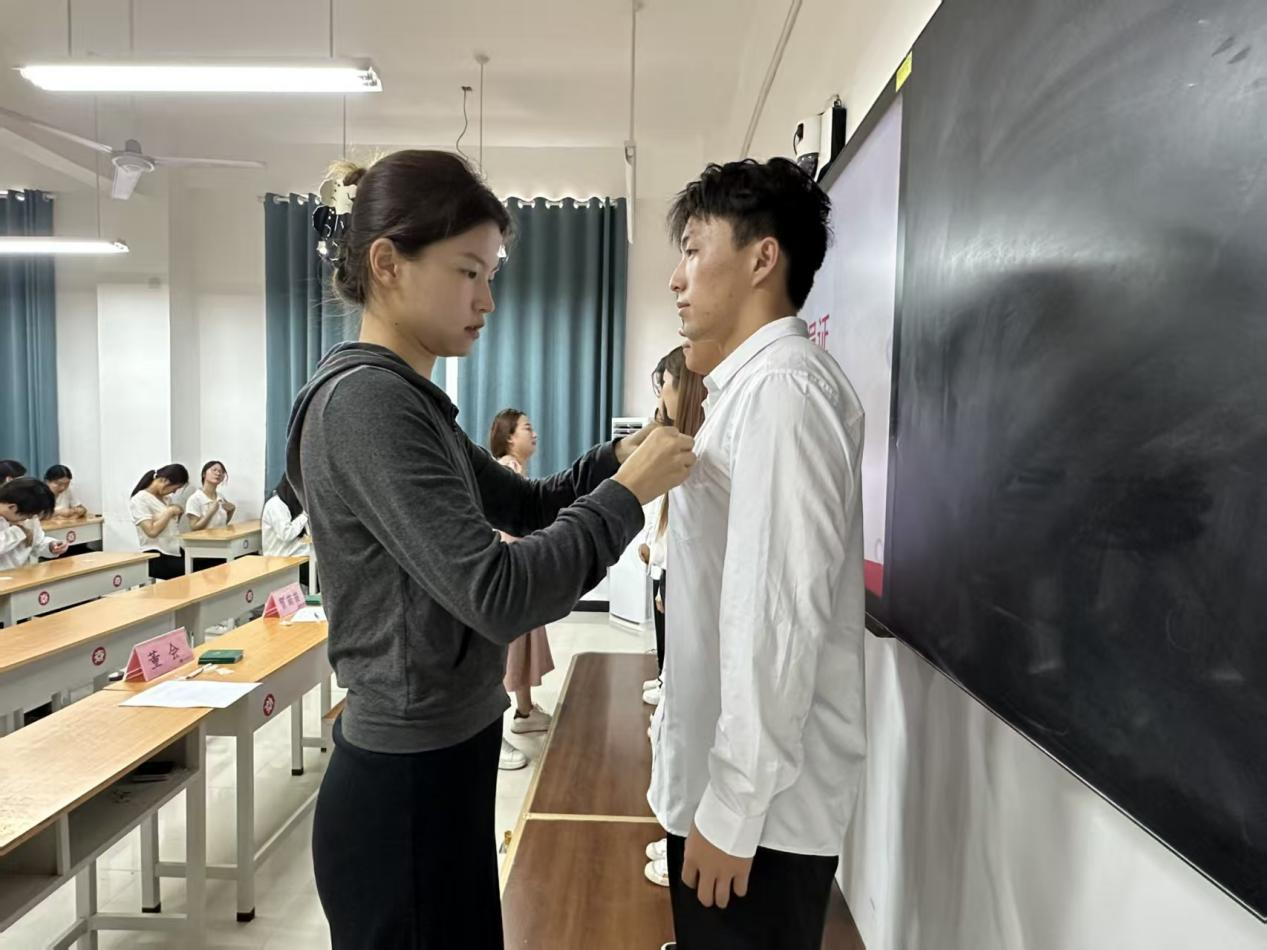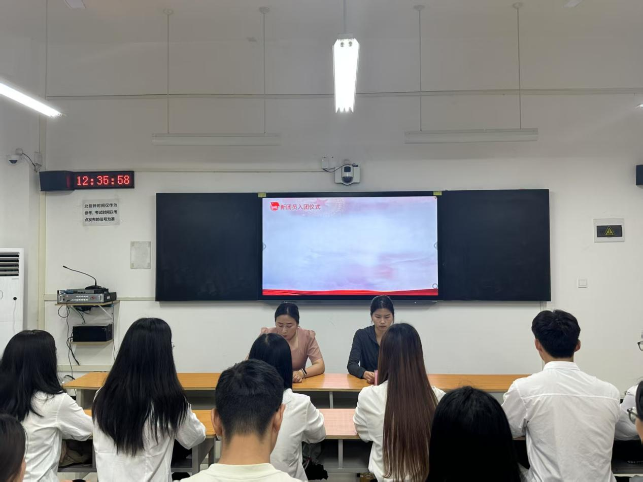 在热烈的掌声中,仪式进入第三项,贺苗苗老师、董会老师为新团员依次佩戴团徽徽章,并颁发团员证。闪耀的团徽佩戴在胸前,沉甸甸的团员证握在手中,这不仅是一份荣誉,更意味着责任与担当。