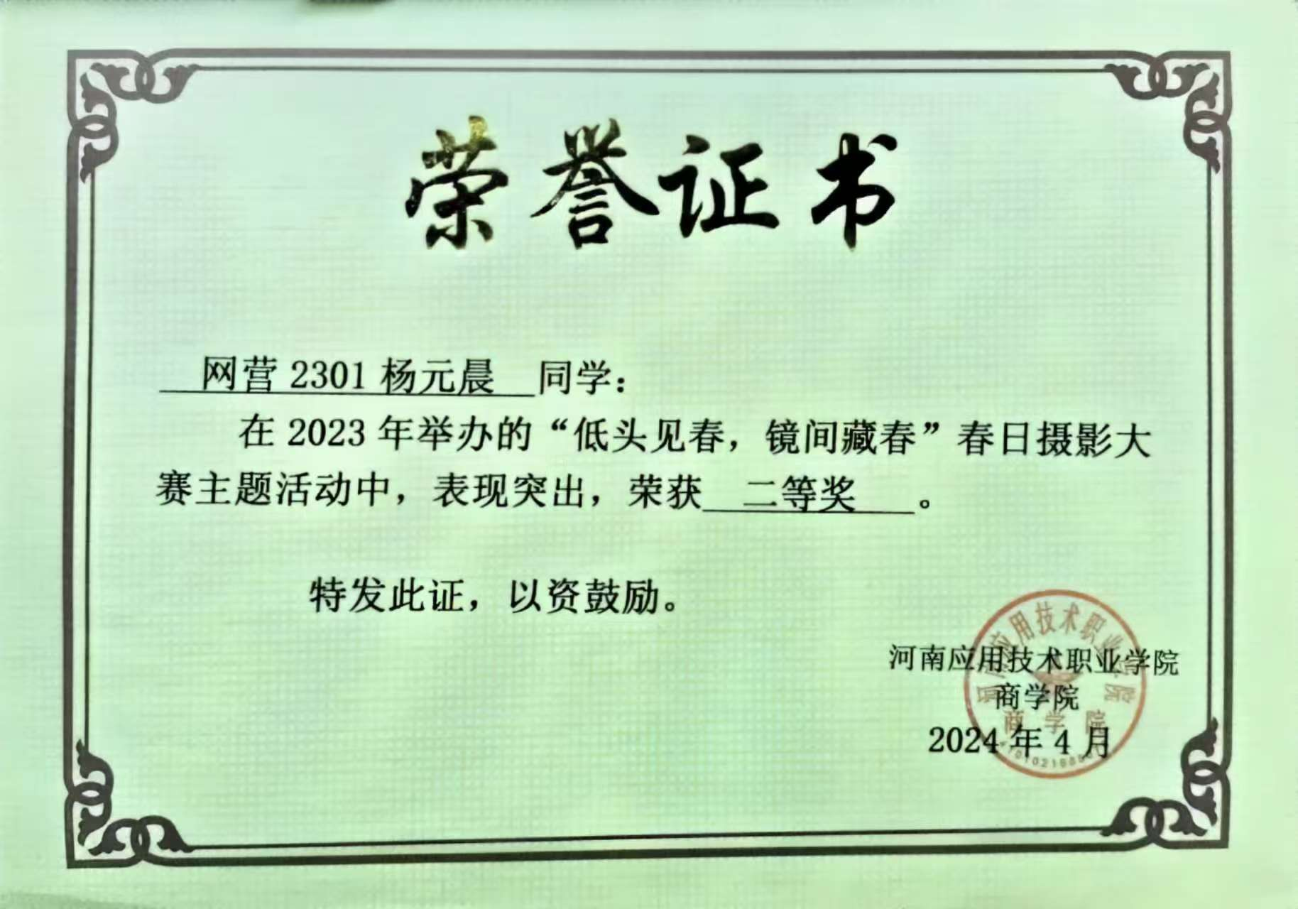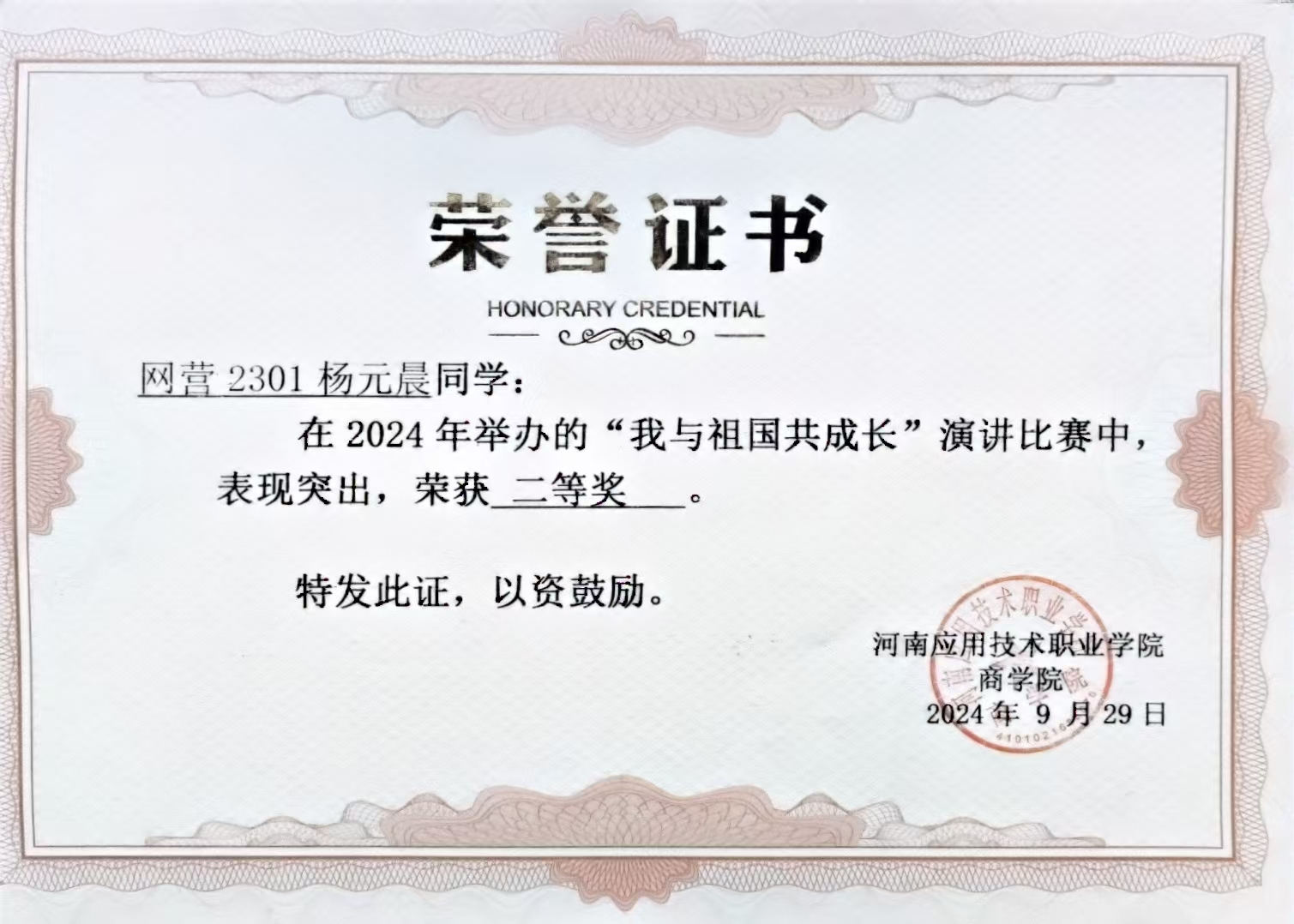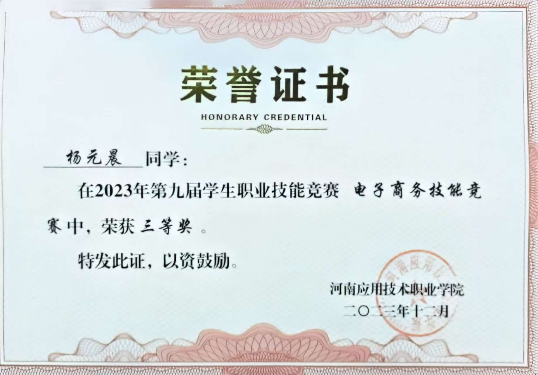 作为一名学生,杨元晨深知学业是本分。她的努力结出了丰硕的果实:学年量化评分高居班级榜首,综合成绩位列班级第二。她的学习成果远不止于课堂成绩,2024年取得国家励志奖学金,也通过自己的努力考取了“中级电子商务师”“1+X呼叫中心客户服务”“二级甲等普通话”等职业技能证书;同时在技能竞赛方面,也取得了一些相应的成绩,“挑战杯大学生创业竞赛”省级银奖4项,“中国国际大学生创新大赛”省级银奖1项,“职业生涯规划大赛”省级铜奖“电子商务技能竞赛”校级三等奖等;在文化素养和表达能力方面,杨元晨同学同样出色,经过不懈努力,她成功斩获“文明风采经典诵读比赛”省级银奖、“校史我来讲,历程谱华章”校级二等奖等。