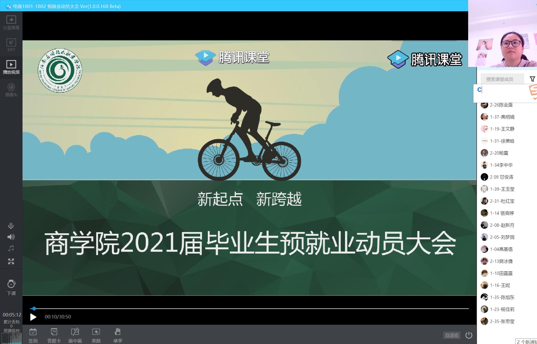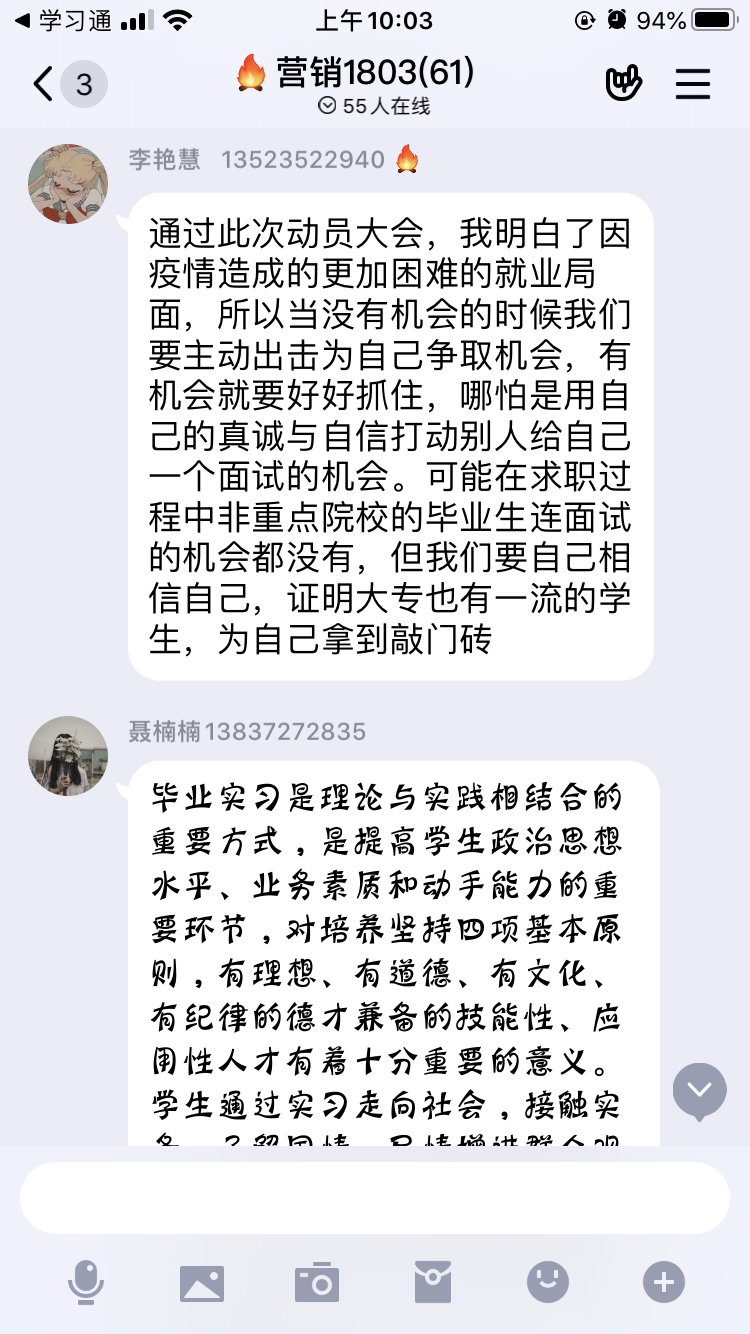 周燕书记分析了今年的就业形势的严峻性及电商行业在疫情中迎来的就业机遇,对同学们提出了“先就业后择业”、“会学习”、“脚踏实地”、“吃苦耐劳”的要求。对就业前各项工作进行了安排部署,希望同学们在疫情防控期间树立正确的就业观念,认清形势,理性分析,接受预就业的考验。